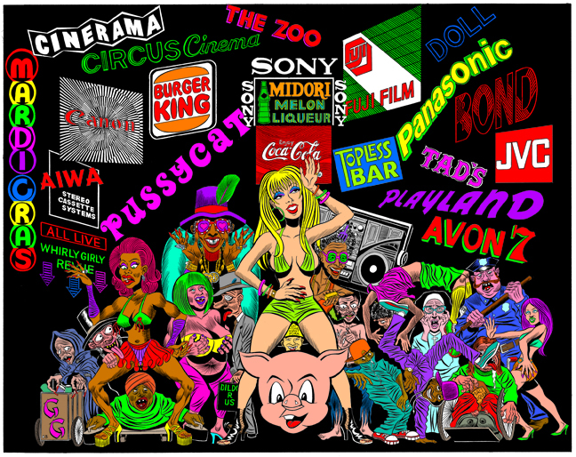 Finally I had reached my destination, revealed to be a circus universe, different from the video arcade down below. Immense in its complexity, the layout remained unseen in its dark dimension. Mirrored spheres swirled like satellites, reflecting an insatiable élan. Announcements of lewd acts echoed from loud speakers. Erotic nude dancing girls of all races wiggled teasingly in front of telephone-like booths. Mysteriously the choreography of their movements mesmerized me, like the models were a manifestation of the music. They boogied to the beat of a nomadic dance, like erotica exemplified their lives. But this realm really reflected a galaxy in itself; a space ship emitting the neon glow of indecency.