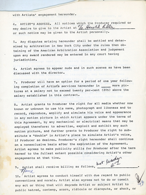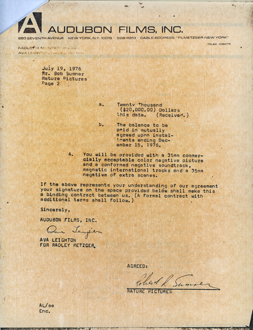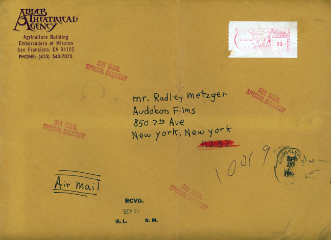 It was sent to Radley Metzger at the offices of Audubon Films in New York. It arrived on September 22nd, 1975, and was stamped ‘A.L.’ and ‘R.M.’ – denoting the owners of Audubon Films, Ava Leighton and Radley Metzger. It was sent by Harold Adler, owner of a San Francisco-based provider of acting talent, the Adler Theatrical Agency.