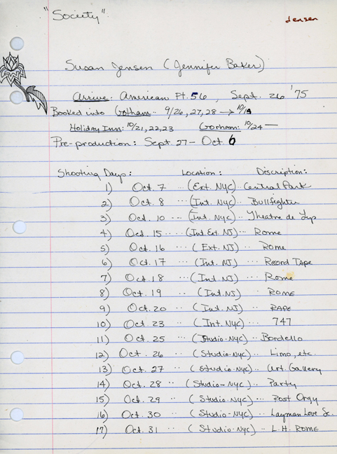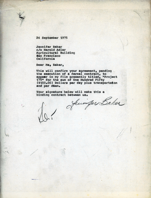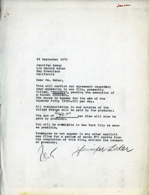 Radley liked her, and when he received the photograph back in New York he showed it to Ava Leighton. She agreed with his choice, and two days later, he sent two letters to ‘Jennifer Baker’. The letters acted as preliminary agreements that Baker would appear in two film projects. The first film was ‘Society’ – which would eventually be called ‘The Opening of Misty Beethoven.’ The second was an unnamed project, referred to only as ‘Project 175.’