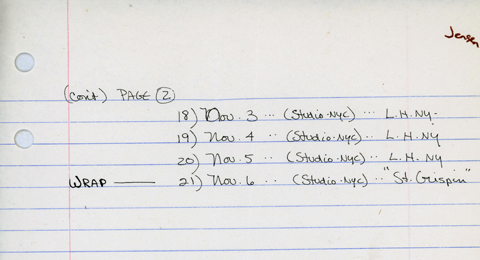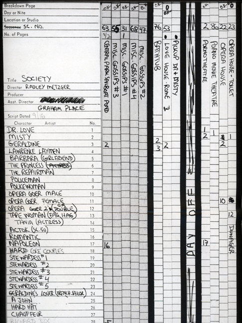 Susan arrived in New York on schedule, and Radley finalized plans to being. This consisted of a series of large spreadsheets listing all the characters and the individual scenes to be shot each day.