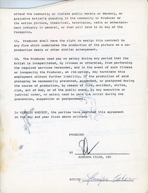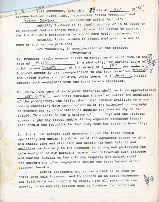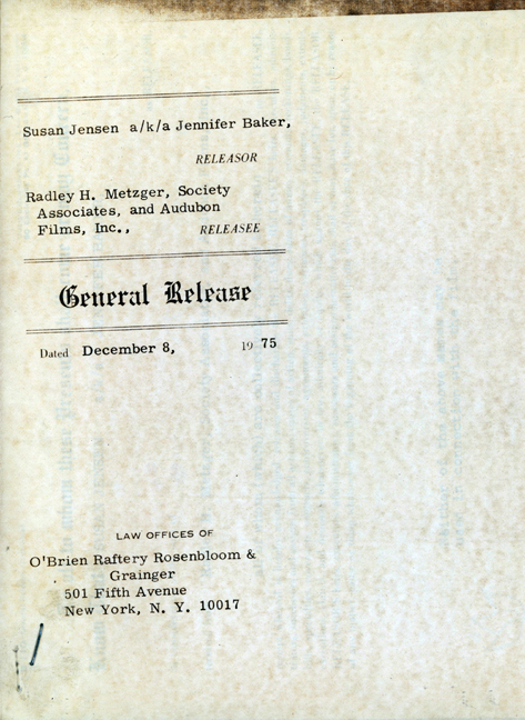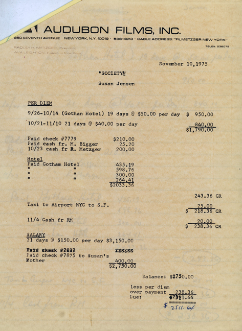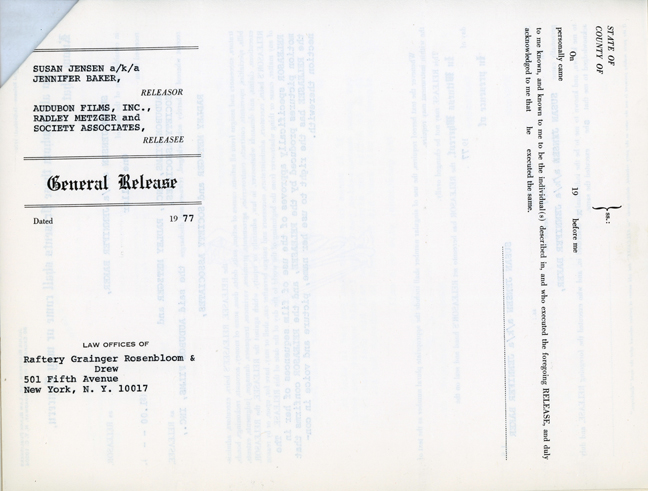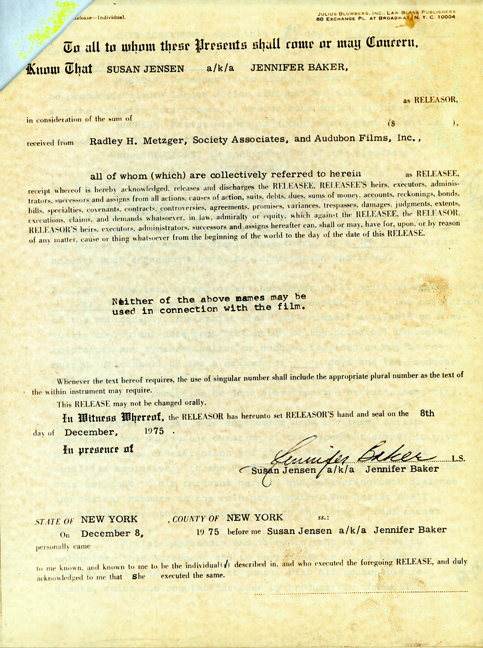 Susan Jensen signed a release for her acting work on October 19th – just after shooting began. It referred only to the work for ‘Society’.
