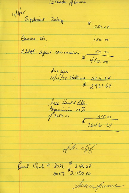 Both Radley and Susan initialed the workings as evidence of their agreement, and two checks were drawn up and sent to Susan. They totaled $2,646.64 – which represented her full payment for her participation in the shoot.