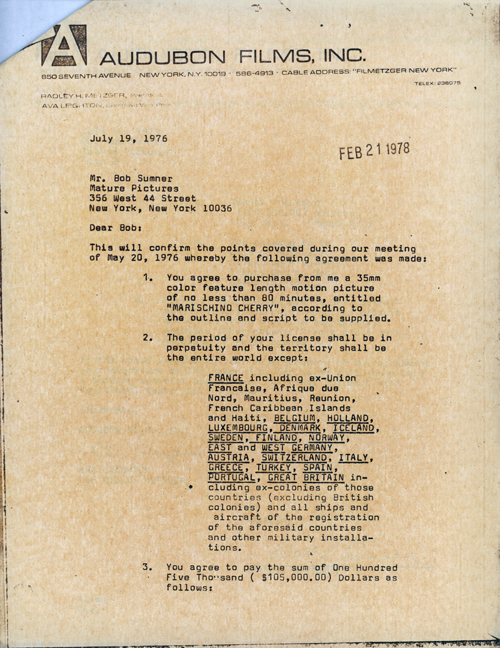 The second film would be made for Sam Lake and Bob Sumner‘s Mature Pictures, and would be called ‘Maraschino Cherry.’ In the summer of 1976, Radley met with Sumner and they agreed that Radley would be paid $105,000 for delivery of the film.