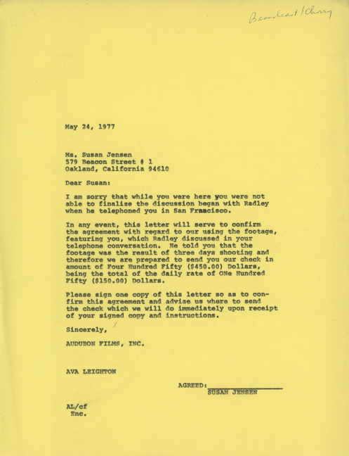 While he was away, Ava Leighton and Audubon attorney Ed Grainger, eventually reached an agreement with Susan and her lawyer. It prescribed that Susan would be paid an additional $2,000 for the scenes used in ‘Barbara Broadcast’ and ‘Maraschino Cherry’. This would bring the total amount amount paid to her to just over $4,600.