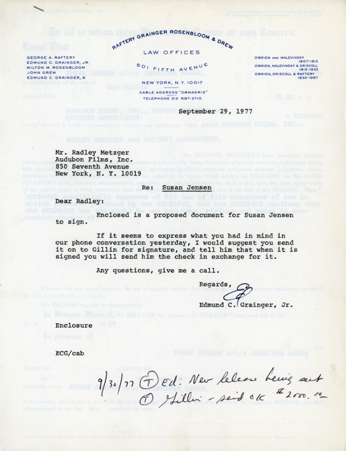 The final step was for Radley to get Susan’s formal consent for her appearance. This was obtained on December 8, 1975, by Radley’s attorney, Ed Grainger, a partner of the legal firm, O’Brien, Raftery, Rosenbloom & Grainger.