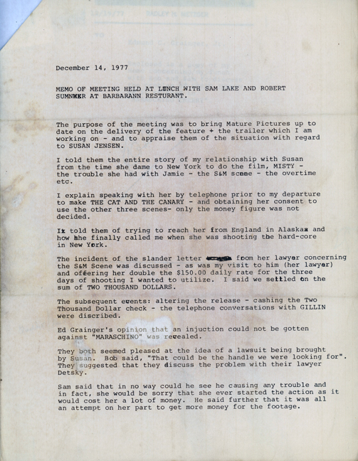 The response from Susan was nuclear: She hired an attorney, Andrew Gillan, who fired off an angry response to Radley and Ava. In his letter, Gillan claimed that Susan had no knowledge that any footage shot in New York for ‘Misty Beethoven’ would be included in future films. Furthermore, Gillian made other incendiary claims: that Susan had not been paid overtime on the production, that she had also suffered at the hands of actor Jamie Gillis, and that the bondage scene had not been filmed in a consensual manner.