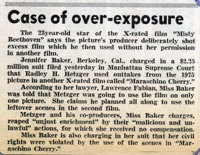 Susan Jensen was claiming damages and compensation totaling $2,250,000 – but she didn’t just take on Radley Metzger through the courts. She also waged war in the media – under her preferred acting name ‘Jennifer Baker’.