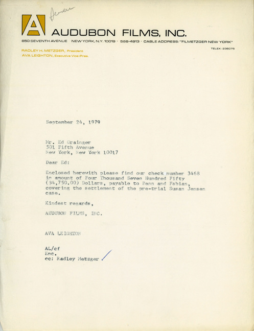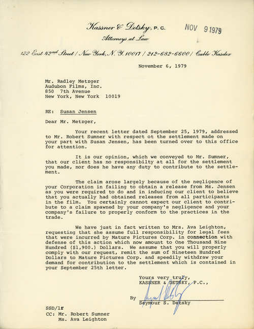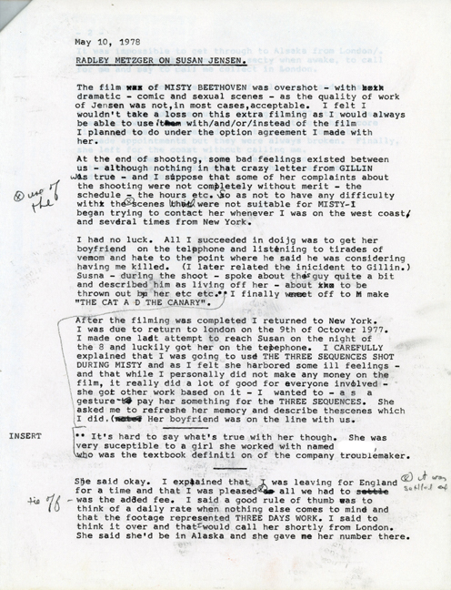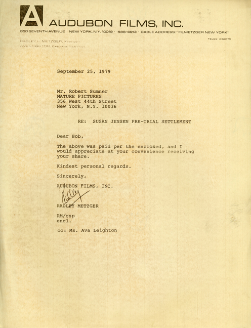 I found this piece particularly interesting because of the original legal source material included. As an attorney who has represented “talent” in suits against the adult industry in the modern era of internet porn, Susan (aka Jennifer / Constance) definitely had a case against Radley and Audubon Films, and the “Maraschino Cherry” producers and distributers. But, not for any money from “Misty Beethoven.”